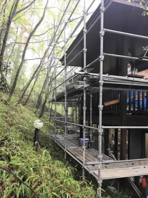 こんにちは。ベストプランニングの山﨑です。 ここのところ現地調査だけでなく、施工中の現場に足を運ぶことも多い日々。 先日行った現場では外壁塗装もあるため、足場が組まれています。 傾斜地に建って