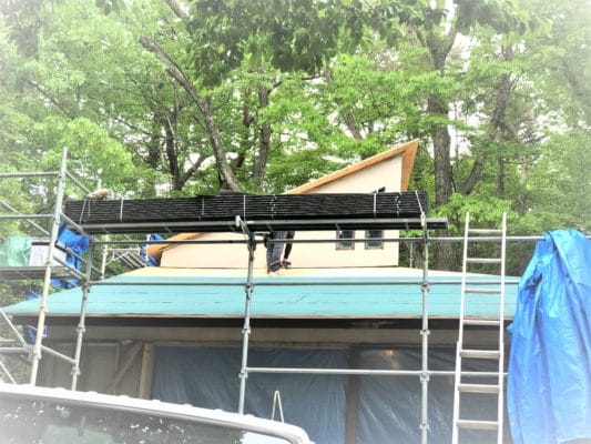 屋根解体が終了し、いよいよ屋根の補修工事が始まりました。 ゴールデンウィークも明けた後、連日激しい雨のため工事が思うようにはかどらなかったです。 既存のスレートを剥がすと結構な痛みを発見! 家屋の屋根には下葺き材という防