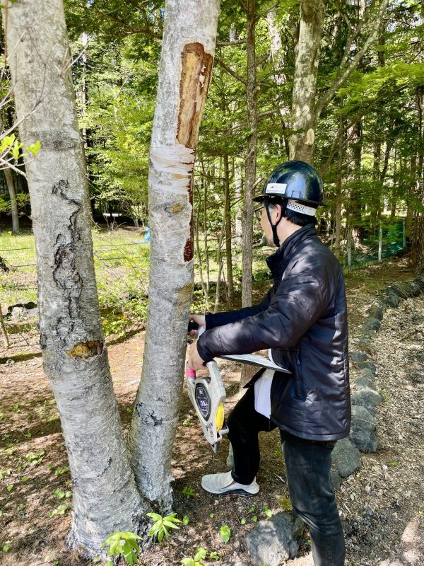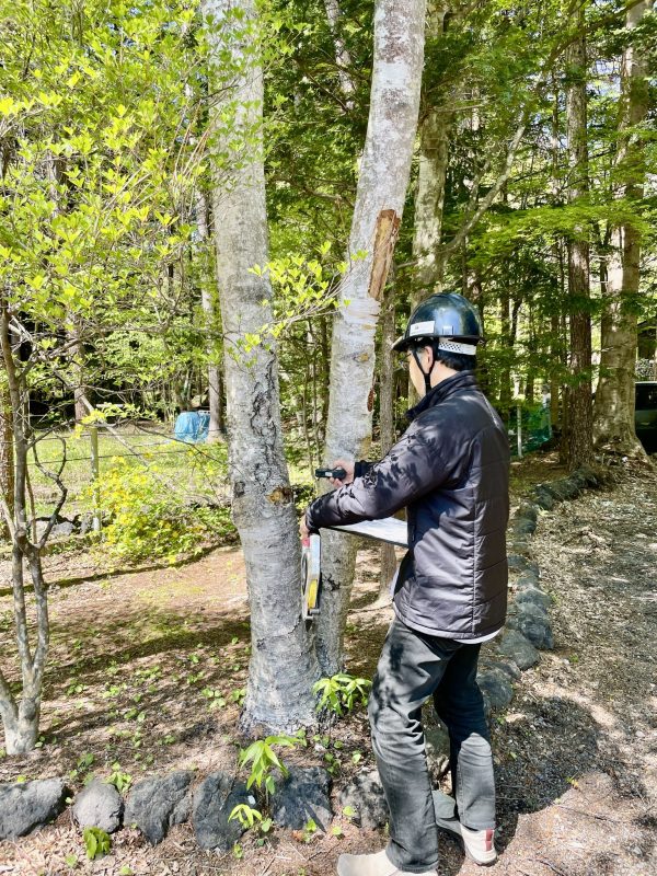 建物の位置を正確に計画するため、敷地内の樹木の位置をレーザー距離計で一本一本丁寧に測り、図面に落とし込んでいきます![]()