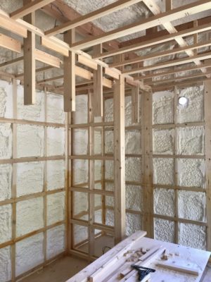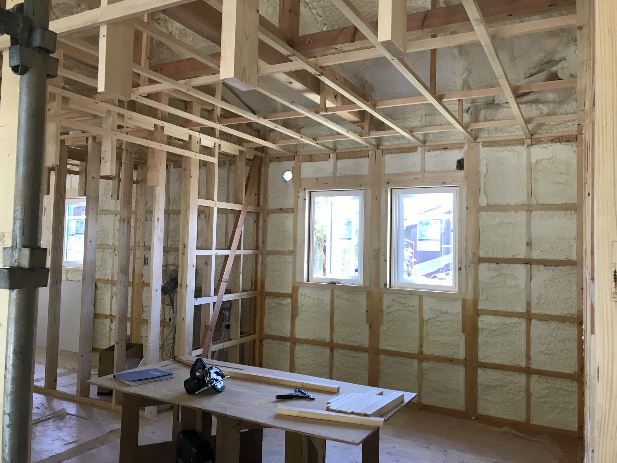 断熱工事を行い老後も暖かい家で過ごすために、【家族3人で過ごす平屋の家】では、吹き付け断熱の施工が行われました。