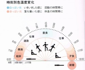 人は色温度が高いほど人は活動的になり、 色温度が低いと安らぎを感じます(*^-^*) 太陽が昇ると活動をはじめ、 夕方から夜にかけて休息するという人の生体リズムです! 照明計画を考える際にはこの自然の営みを念頭に入れておくと 良い...