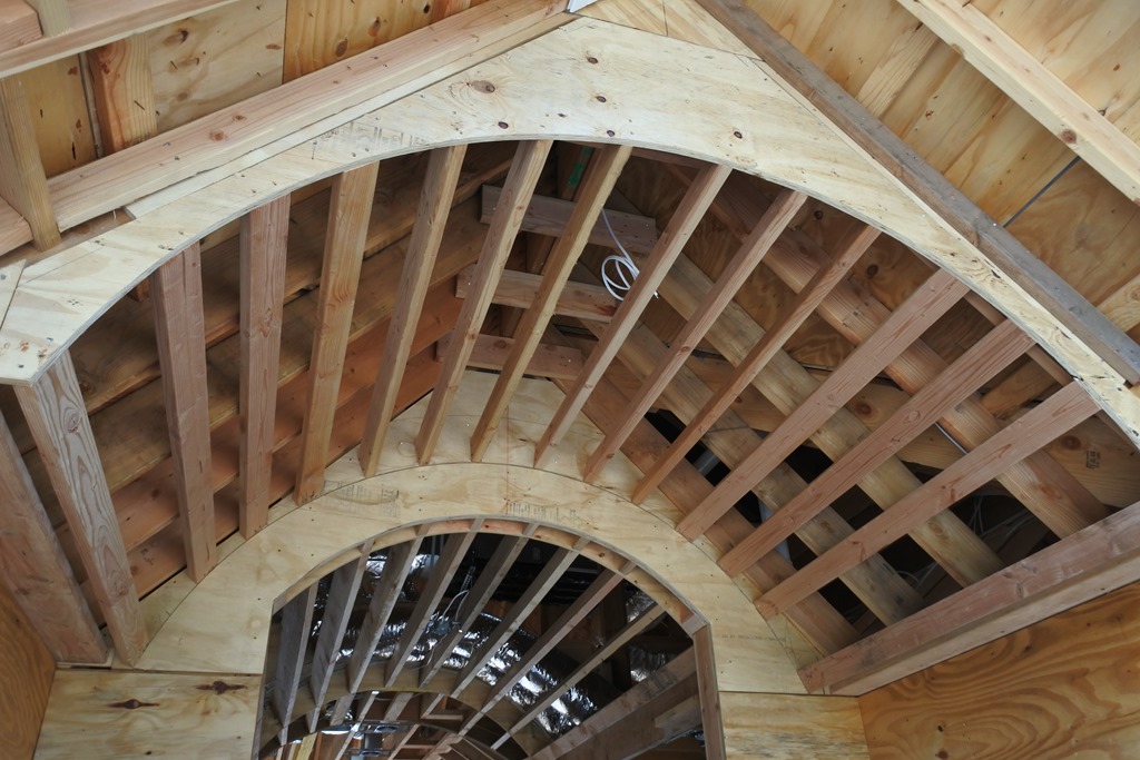 ワイルドな大工さんがあっという間にアーチ状の天井と開口部を作っていきます。