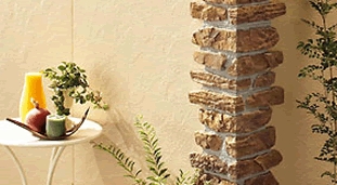 家のコーナーとなる部分をレンガ調、ストーン調のカバーにて覆う
