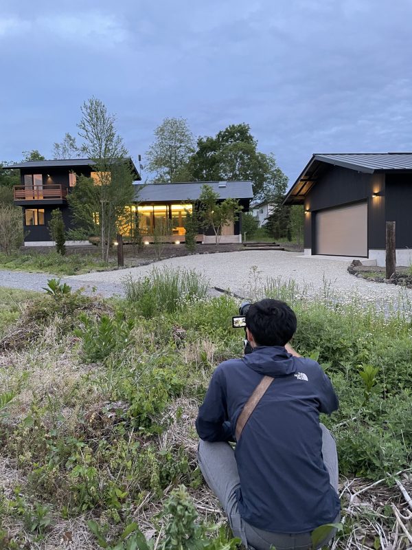 当日、夕方になると冷え込み、寒い中での撮影でしたが、幻想的で温かみのある光が住まいを優しく包み込み、とても美しいシーンを収めることができました。